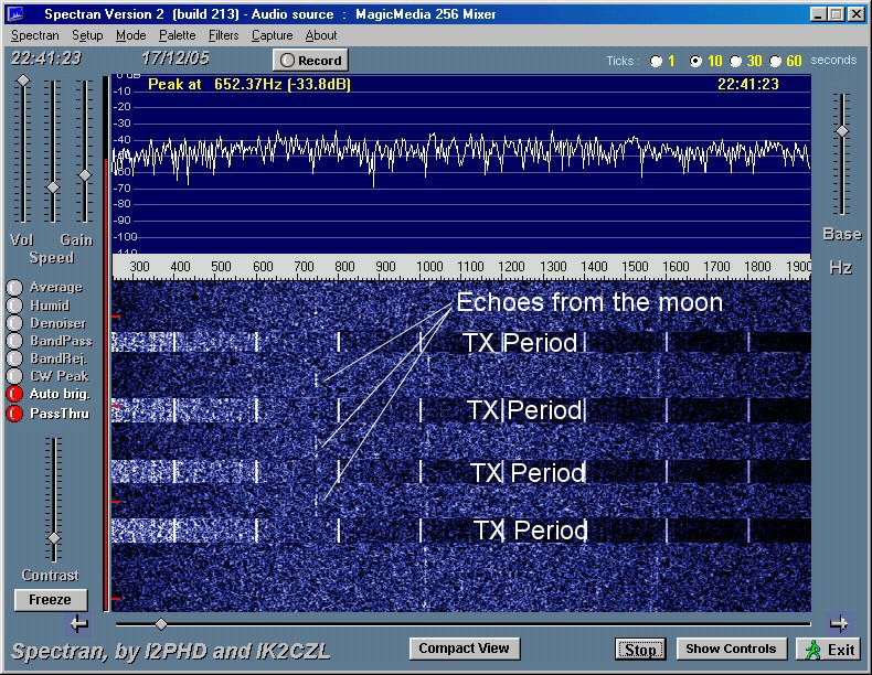 Problems .. During the weekend of 10/11 Jan, I put the sytem up, and was testing.. I was able to see my own echoes on spectran, weak but unmistakable.. occasional I could hear tones on libration peaks.