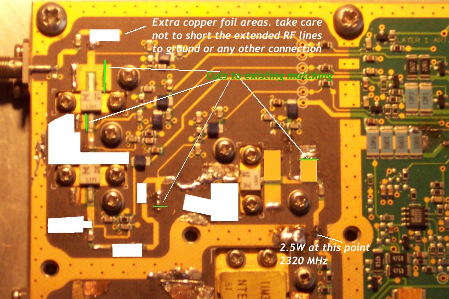 Some detail of the experenental matching changes to the first 3 stages to allow operation on 2.3GHz.. I have got 2.5W out for 1mW drive, the PA device has proved difficult, as there is very little room to put tuning tabs on the board. These are for guidance only, you may have to tweak the matching to acheive the same results.