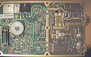 The Ionica PA (unmodified) gives 15W, I have cut the front end stages from an RX block for a preamp, and chopped one of the pin diode attenuator sections from the base station motherboard to give me a 10-30dB variable attenuator for the power amp input. The whole lot runs from 12V, as the -12V is generated by an inverter (see the PA mod page), and this also allows the use of a 28V coax relay. as a simple indicator of TX op power I have used the inbuilt RF detector output to drive a LED via 270Ohm resistor. Brightness varies with output power.