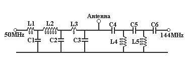 L1 is primarily to improve the input match. C3 L3 form a phase shift network and are in the circuit to ensure that the impedance of the 50 MHz filter as seen at 144 MHz at the antenna port is on open circuit.