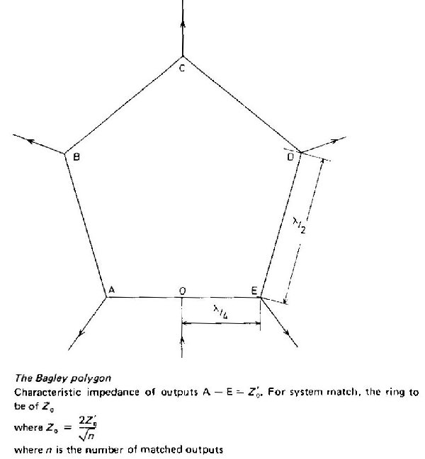 If the network is fed by five signals at A, B, C, D and E each will cancel at each of the other input points but will add at 0. Hence provided that the phase of the sources at B and D have been reversed by an extra half wavelength of line, the polygon acts as a five-way signal combiner.