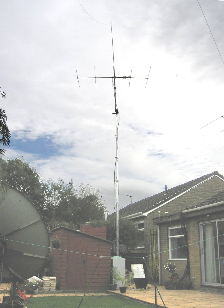 This is my pump-up hilomast complete with 4m yagi, with added old 70cm colinear to give a vertical height of 12m. The whole mast is stood off on PTFE insulating blocks.