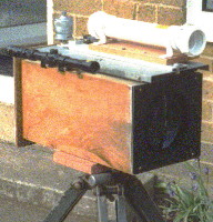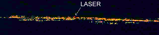 My first and best QSO to date took place on 09.05.98 with GM4RJX/P. I was located near the Blackhill TV Transmitter, whilst Jim was the other side of Glasgow near Greenock. The distance was 46Km, which we believe was the UK record for 2 way laser communications at the time. Signals were many dB above noise, even with all the city lights. Once we had the lasers aligned , both were clearly visible to the naked eye, and the PIN diode receivers had no problem resolving the 800Hz tone. Jim took a photo of the QSO! My laser is clearly visible on the skyline.