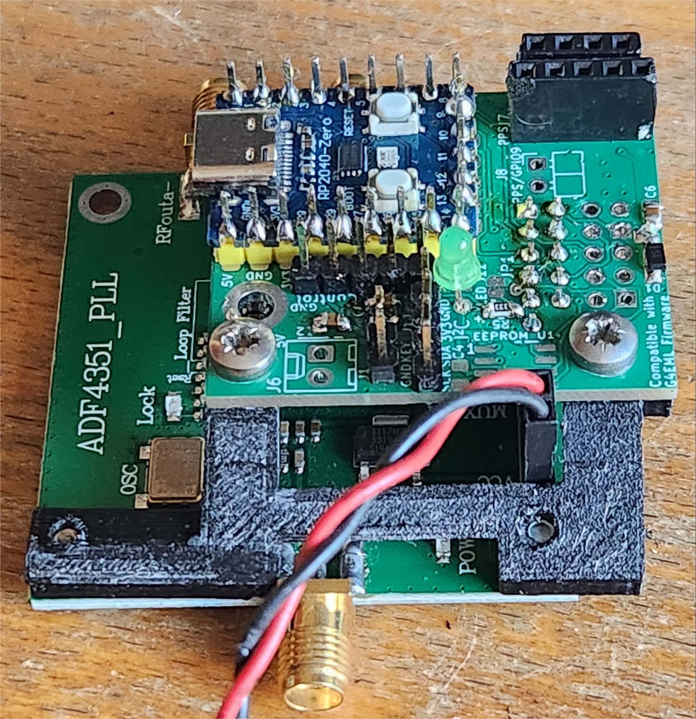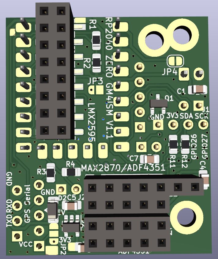 The PCB marshals SPI etc from the RP2040 Zero and is designed to plug directly onto several PLL evaluation board headers
